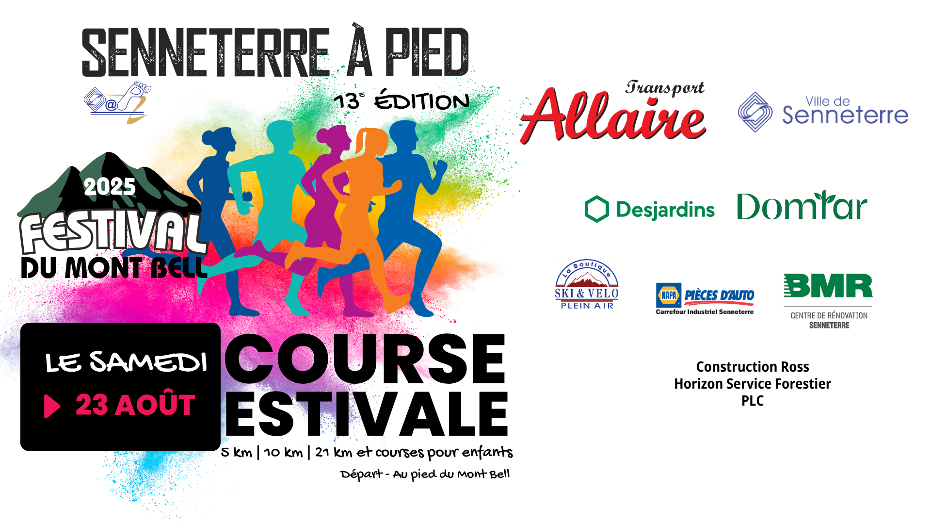 Le samedi 23 août en avant-midi, les organisateurs de Senneterre à pied vous propose une 13e édition de course estivale. Avec un parcours inédit sur le site du Mont Bell, des courses de 5, 10 et 21 km ainsi que des courses pour enfants sont offertes, autant pour les débutants que pour les plus expérimentés.