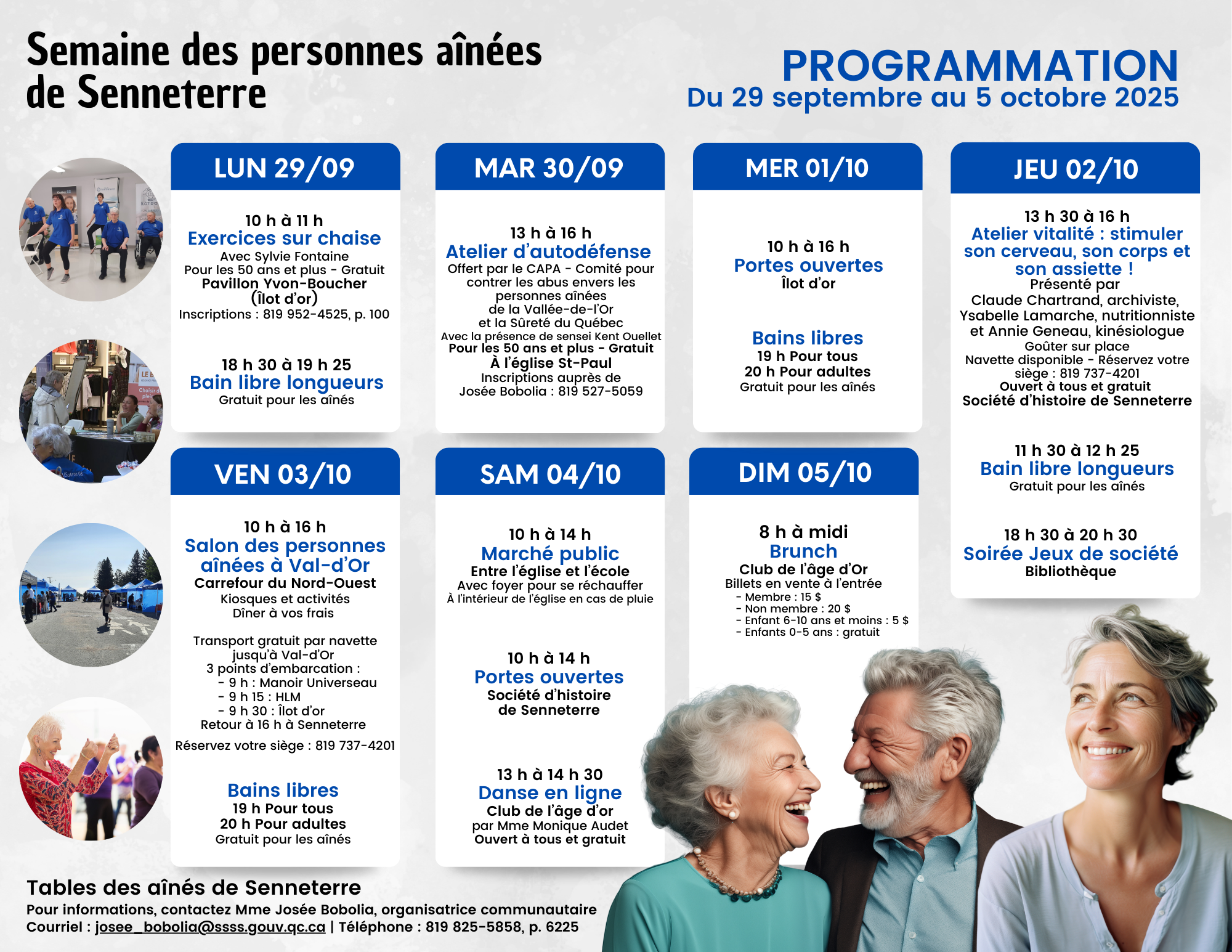 La Table des aînés de Senneterre est heureuse d'annoncer la tenue de la Semaine des personnes aînées, qui se déroulera du 29 septembre au 5 octobre 2024. Cet événement est l'occasion idéale de mettre en lumière l'importante contribution de nos aînés à la communauté et de leur offrir des moments de partage et de divertissement.