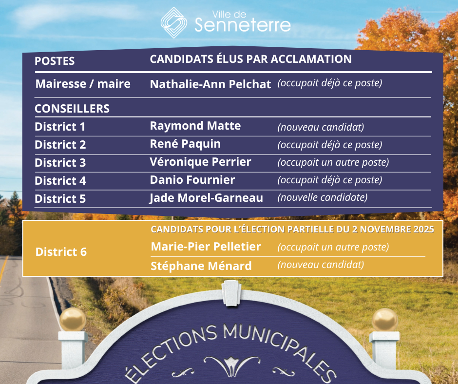 La période de mise en candidature pour les élections municipales a pris fin aujourd'hui, le vendredi 3 octobre, à 16 h 30. La majorité des candidats au conseil municipal ont été élus par acclamation, à l'exception du district 6, où deux candidatures ont été déposées :
