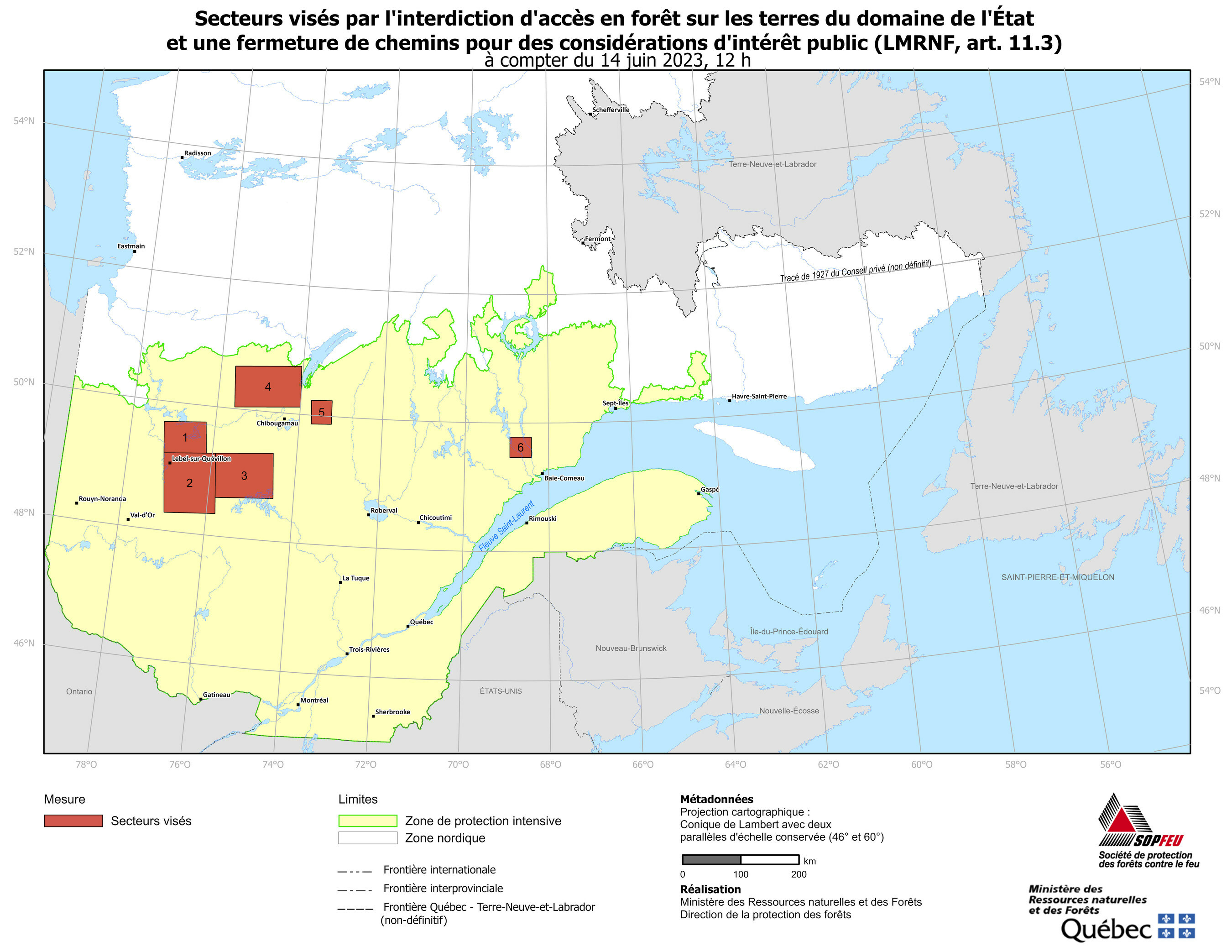 Pour connaître la délimitation exacte du territoire où l'interdiction d'accès en forêt est toujours en vigueur, consultez ce lien : https://www.foretouverte.gouv.qc.ca/?context=_IAFC
