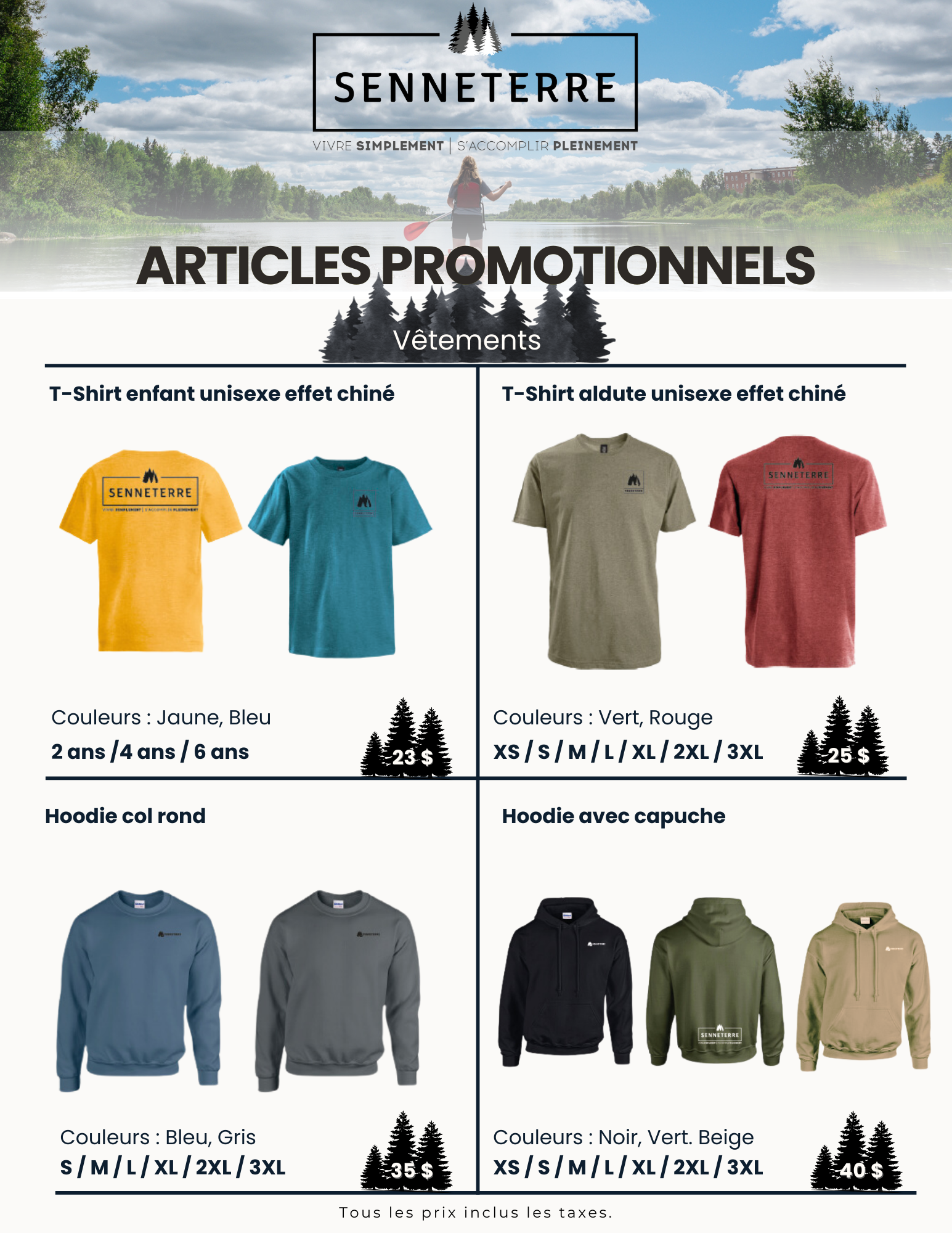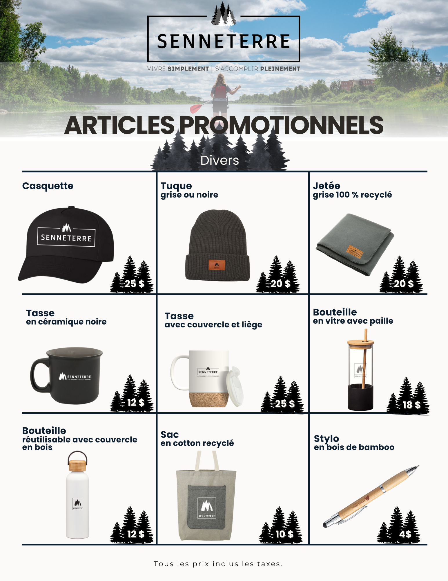 Nous sommes heureux de vous proposer une gamme d'articles à l'effigie de Senneterre, mettant en valeur notre image de marque créée dans le cadre de la campagne d'attractivité. Venez découvrir ces articles uniques et fièrement afficher votre appartenance à notre belle communauté!