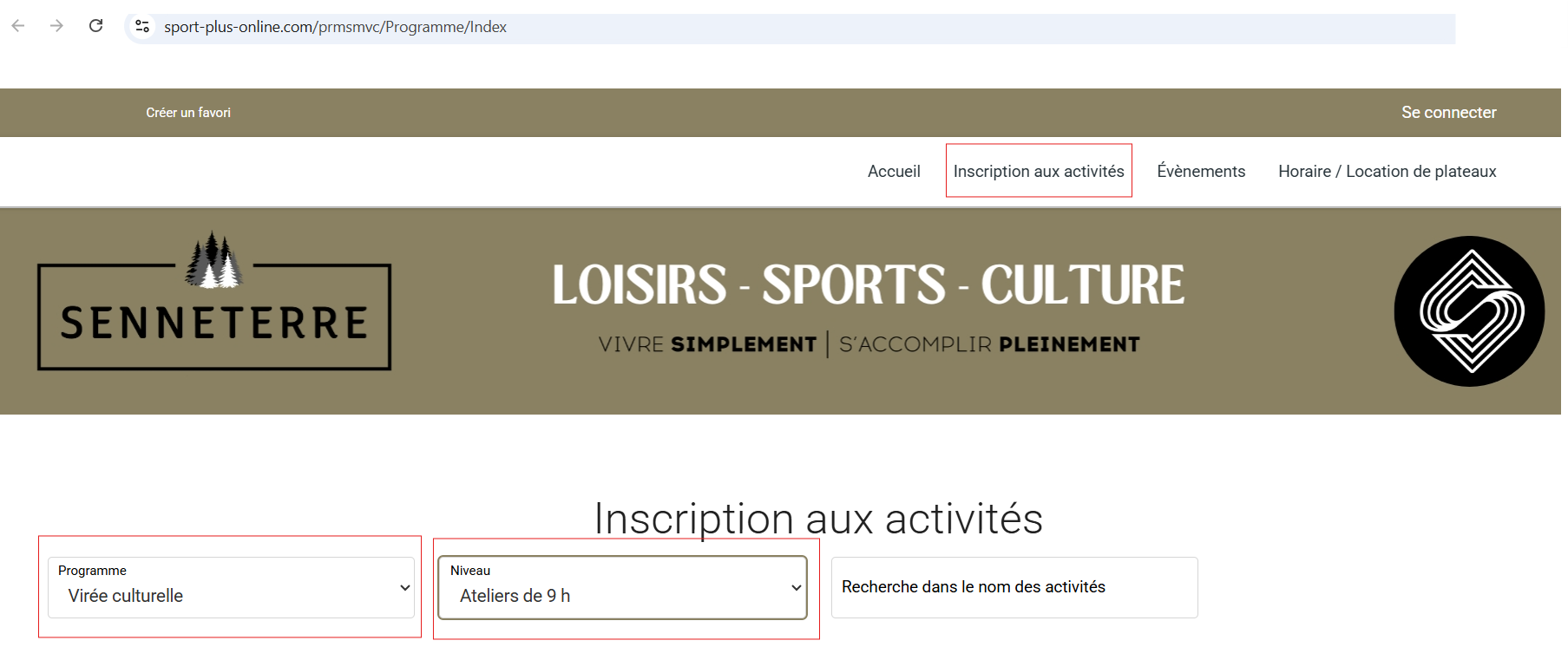 - Dans l'onglet Inscription aux activités, choissisez le programme "Virée culturelle".