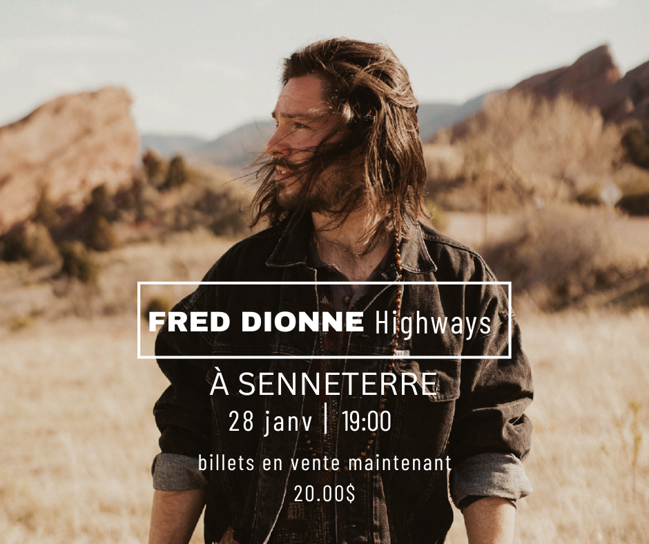 FRED DIONNE - Dès la parution de son premier album Highways à l'automne 2022, l'auteur-compositeur-interprète Fred Dionne se démarque sur scène comme dans les médias. Il parcourt actuellement le Québec en première partie de Matt Lang, 2Frères et David Laflèche et son premier extrait radio Hangover se retrouve au sommet des palmarès des grandes chaînes de radio dont CKOI, NRJ et WKND. Fier d'un franc succès sur la scène locale et internationale au sein du collectif Les Jacks, alliant entre autres la première partie de Bryan Adams à Dubaï, des prestations télé, du succès à la radio commerciale ainsi que des centaines de spectacles à travers le pays, c'est maintenant en son propre nom que Fred Dionne met son identité musicale en lumière. Il présente Highways, un premier spectacle au son country-folk bohémien francophone.
