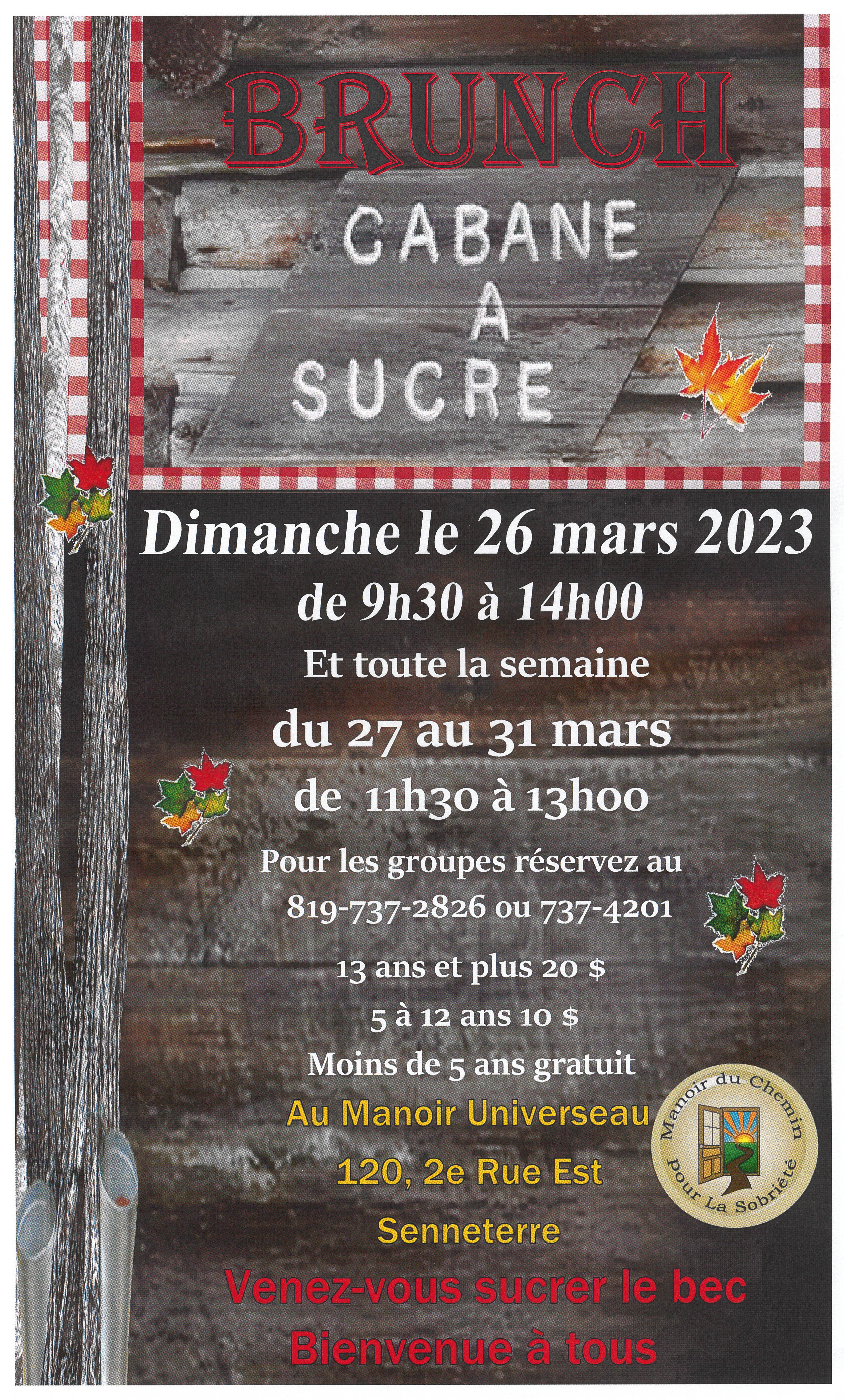 Campagne de financement sous le thème cabane à sucre au Manoir du chemin pour la sobriété du 26 au 31 mars 2023.