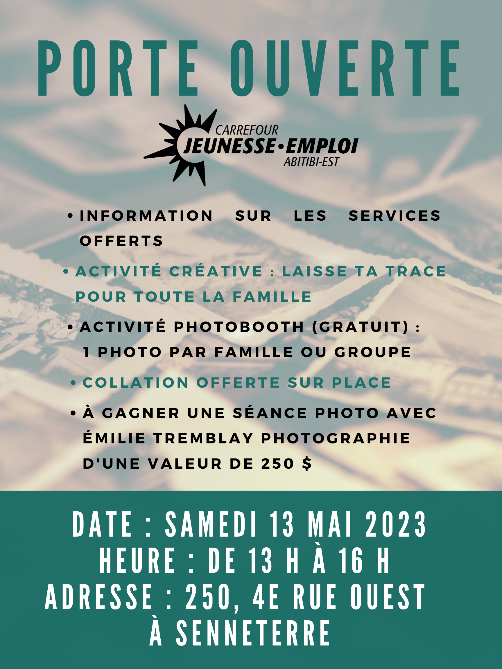 Pour la Semaine québécoise des familles, le CJEAE point de service de Senneterre, vous invite à ses portes ouvertes le samedi 13 mai de 13 h à 16 h au 250, 4e Rue Ouest.
