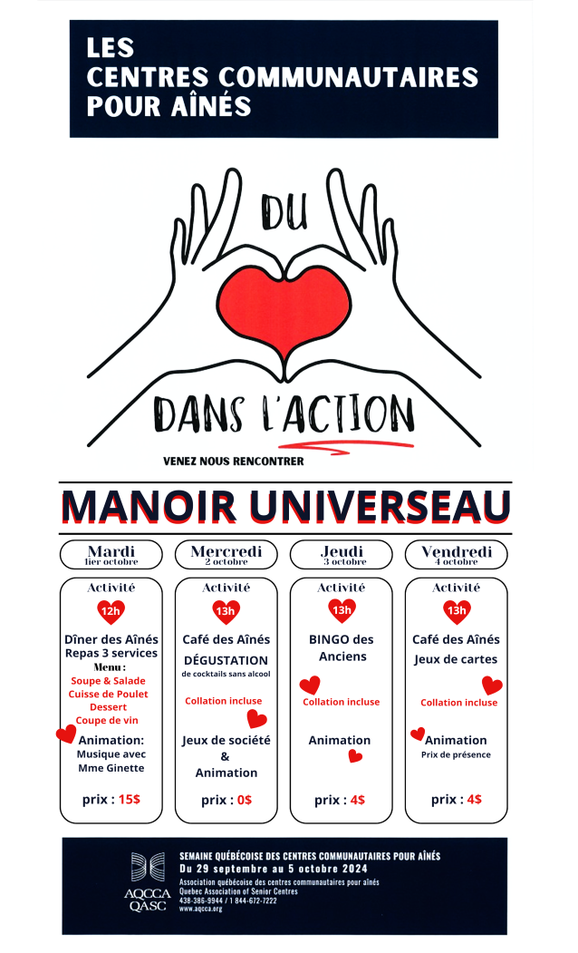 Dans le cadre de la Semaine québécoise des Centres communautaires pour aînés, le Manoir Universeau organise une série d'activités!