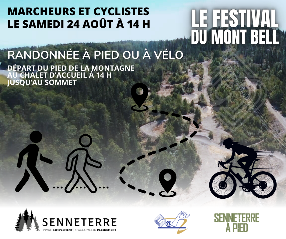 Le départ se fera au pied du Mont Bell, au chalet d'accueil à 14 h. Venez parcourir les sentiers à pied ou à vélo jusqu'au sommet où plusieurs activités se dérouleront.