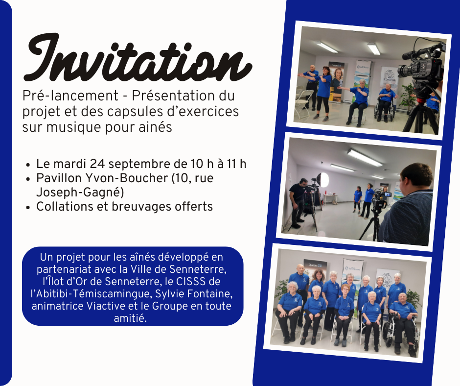 La Ville de Senneterre, en collaboration avec ses partenaires, a le plaisir de vous inviter au pré-lancement du projet de capsules d'exercices sur musique pour aînés.