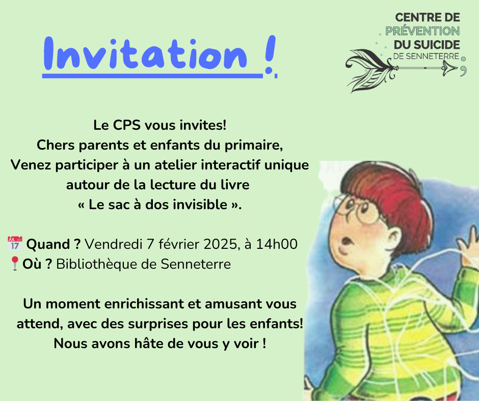Le Centre de prévention du suicide de Senneterre invite les parents avec enfants au primaire à participer à un atelier interactif unique autour du livre "Le sac à dos invisible".