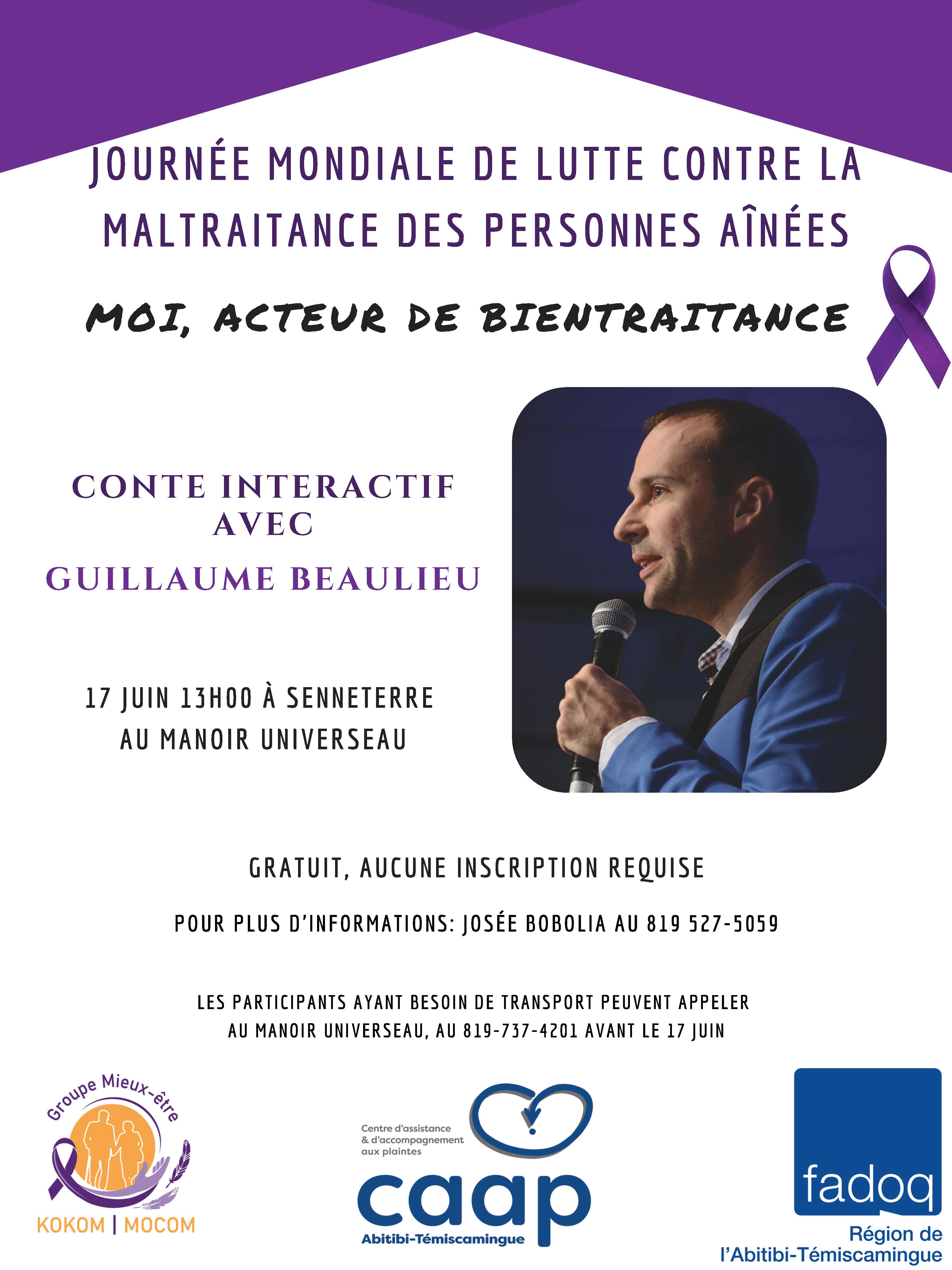 Activité offerte par le Groupe Mieux-être Kokom/Mocom, le CAAP, la FADOQ ainsi que le CAPA, dans le cadre de la Journée mondiale de lutte contre la maltraitance des personnes aînées.