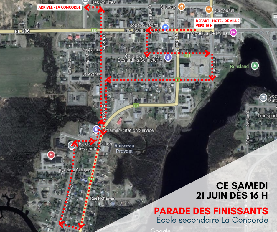 Dans le cadre du bal des finissants de l'école secondaire La Concorde, il y aura une parade dans les rues de Senneterre. Le départ se fera à l'Hôtel de Ville vers 16 h.
