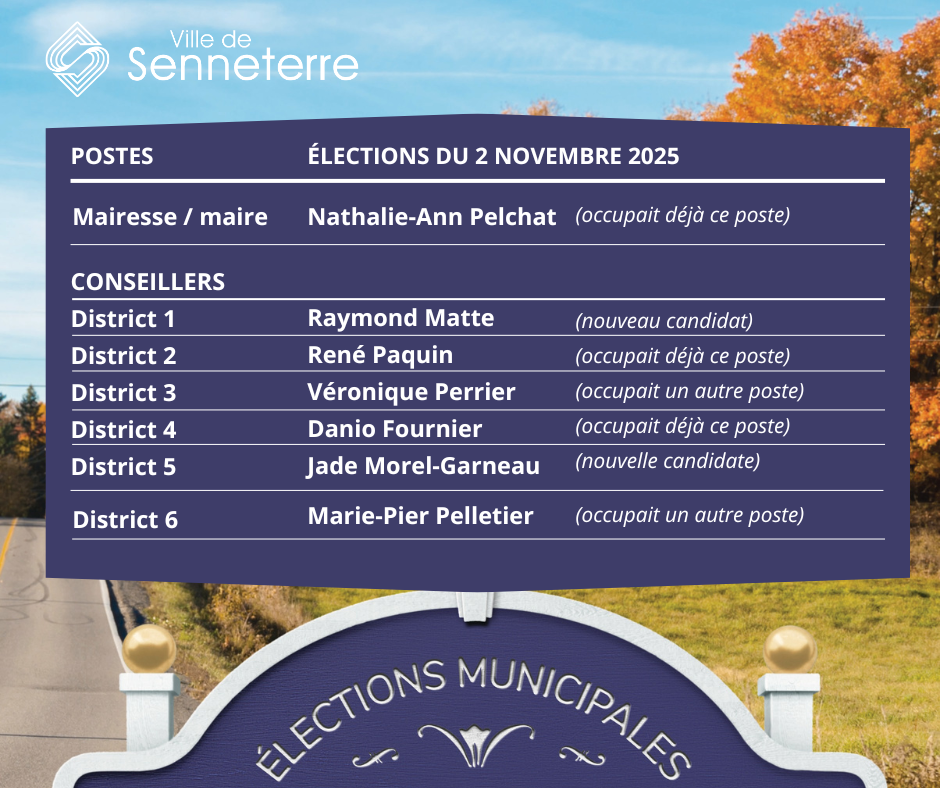 Le dimanche 2 novembre 2025, de 10 h à 20 h, les électrices et électeurs du district #6 de Senneterre-Ville étaient appelés à voter dans le cadre d'une élection partielle afin d'élire leur représentant ou représentante au sein du conseil municipal.